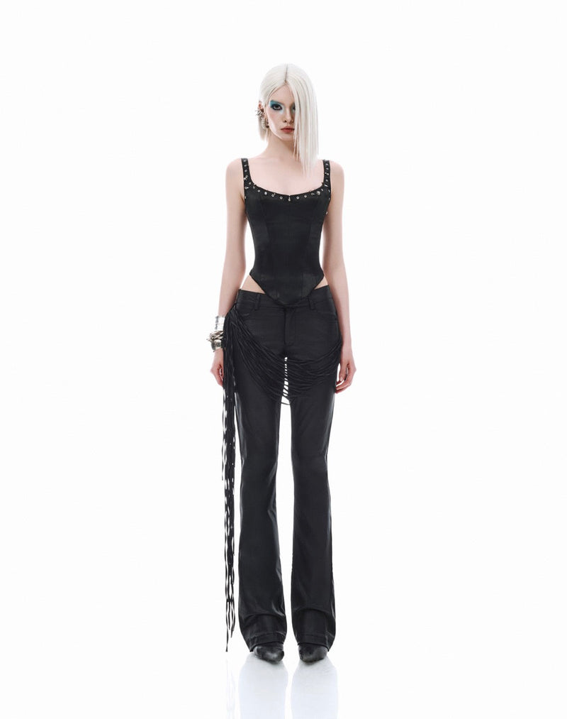 - These leather skinny pants feature a striking fringe detail on one side, adding a bold and edgy accent to your look.