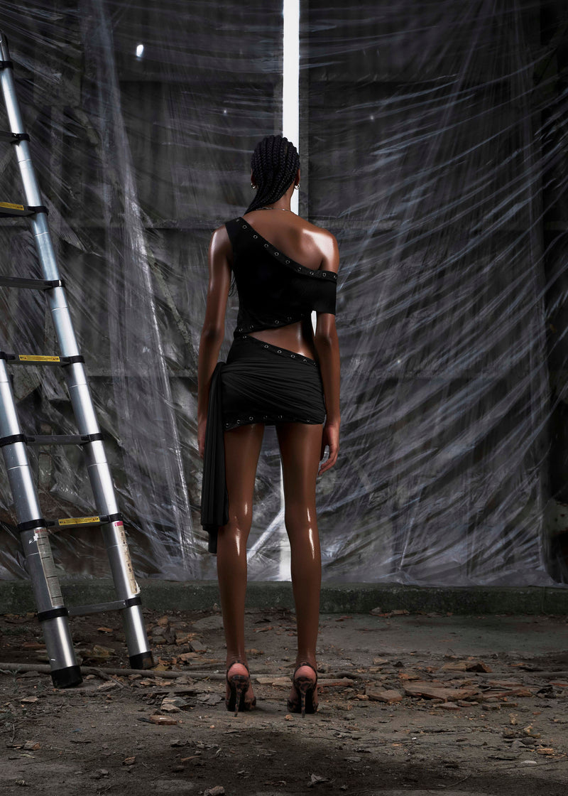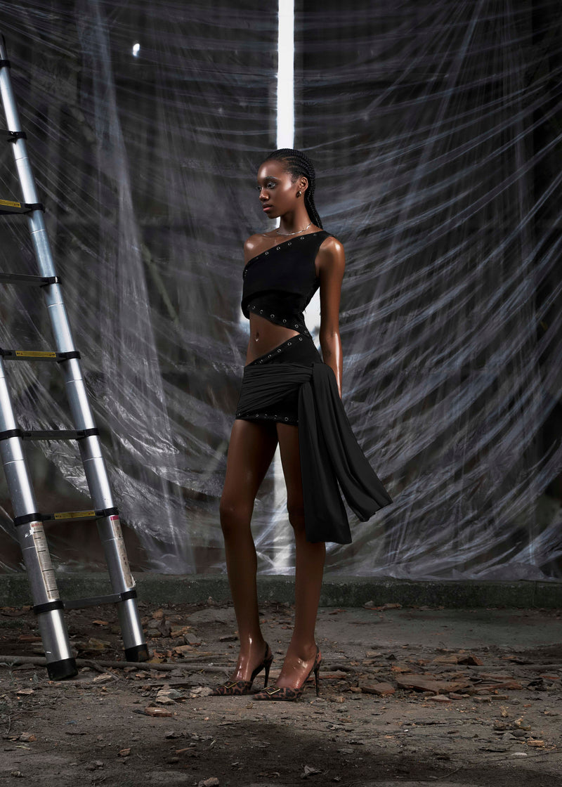 - Detail: Full body print, off-shoulder on right side, collar sewn with perforated hem along collar, short sleeve on left side, deep waist cut to create slim waist, skirt with mesh hem that can be tied in many ways, thigh length