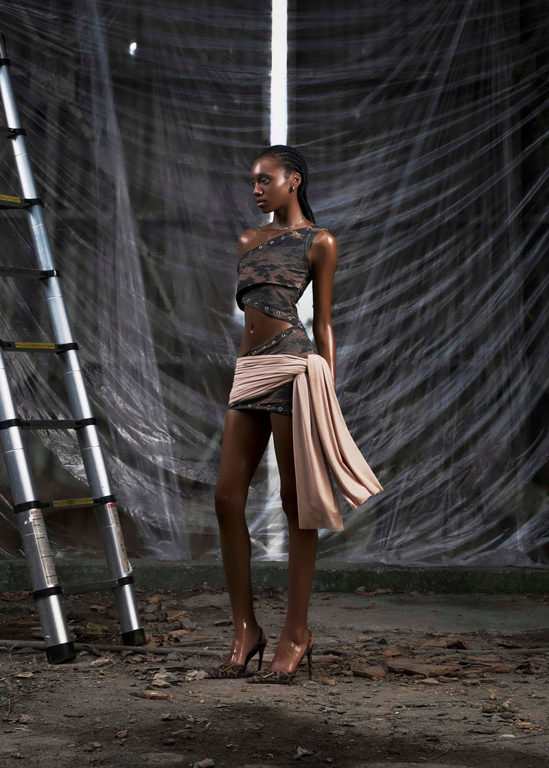 - Detail: Full body print, off-shoulder on right side, collar sewn with perforated hem along collar, short sleeve on left side, deep waist cut to create slim waist, skirt with mesh hem that can be tied in many ways, thigh length