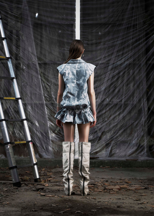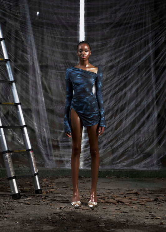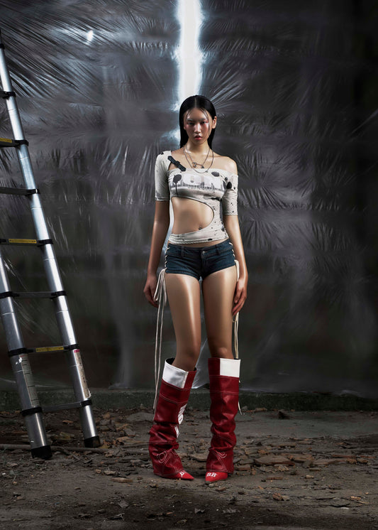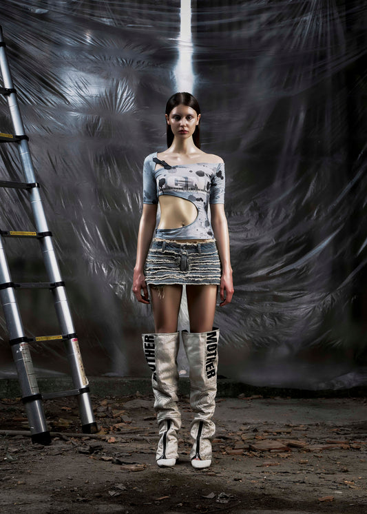 - Detail: Full body printed pattern, front waistband with laces, two back pockets with laces, flared leg with flared zipper, zipper at the hips