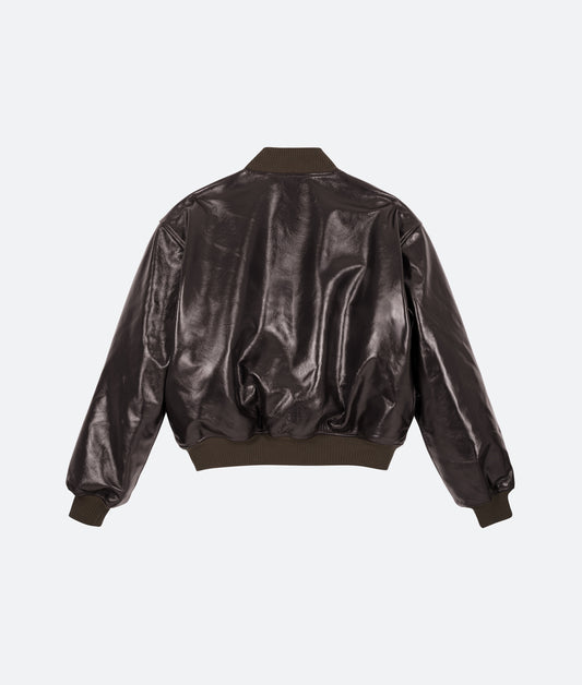 FRAGILE® Brown Cropped Leather Bomber Jacket