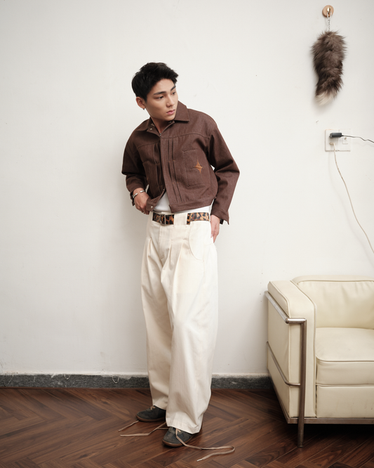 Cream Herringbone Loose Baggy Pants