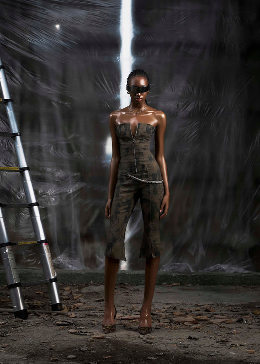 - Detail: Full body print, off-shoulder on right side, collar sewn with perforated hem along collar, short sleeve on left side, deep waist cut to create slim waist, skirt with mesh hem that can be tied in many ways, thigh length