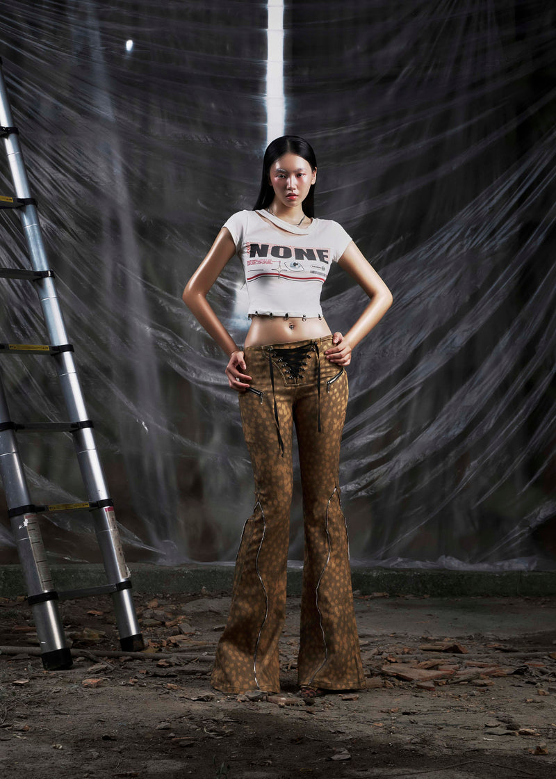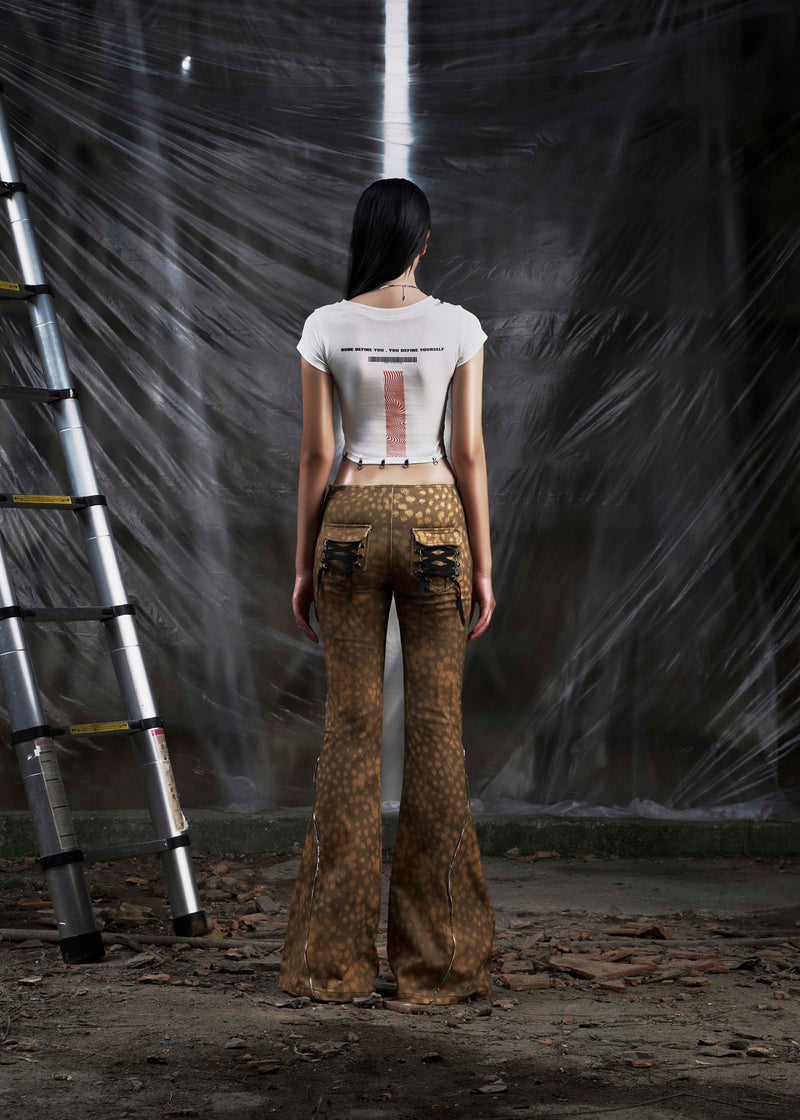 - Detail: Full body printed pattern, front waistband with laces, two back pockets with laces, flared leg with flared zipper, zipper at the hips