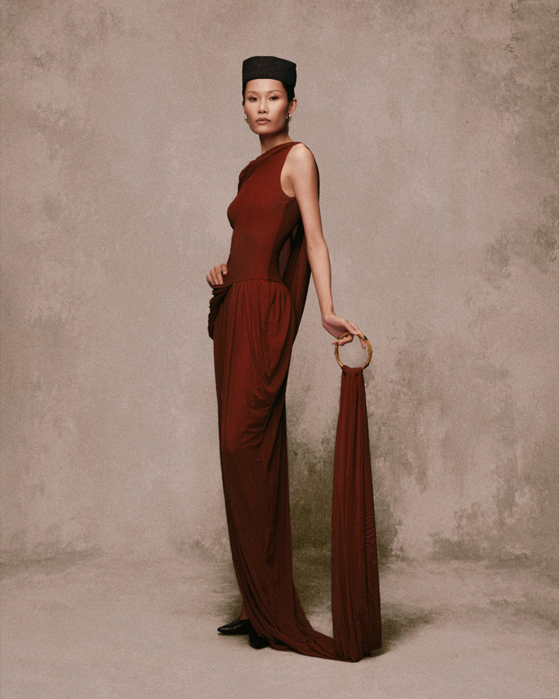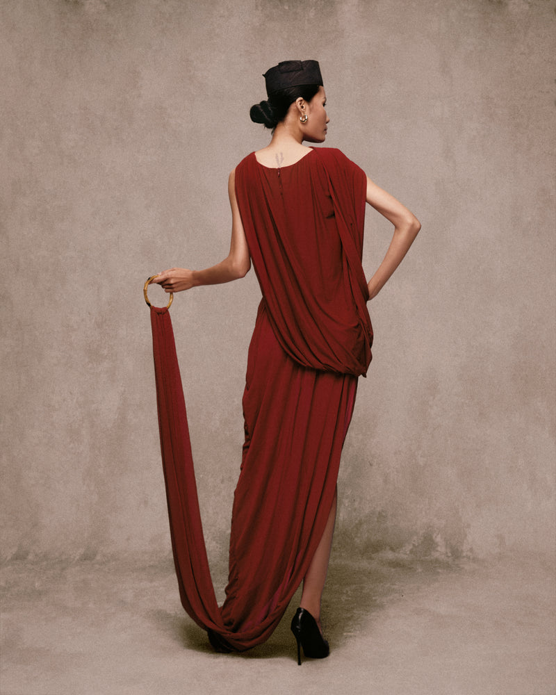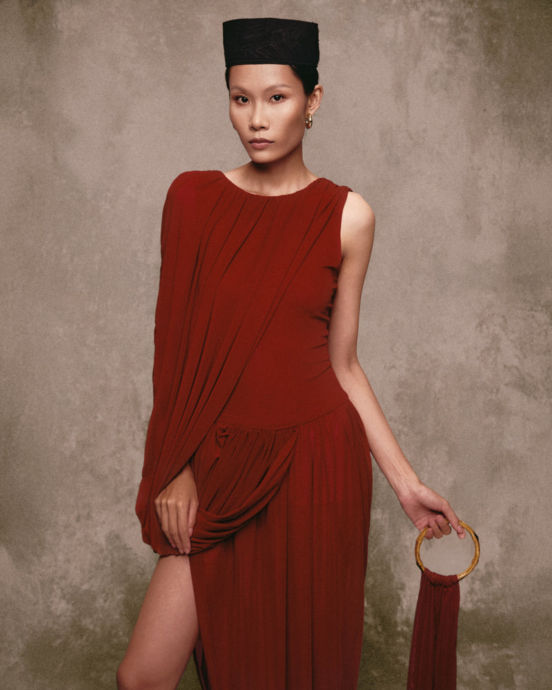 - Asymmetric, unconventional, and contemporary, this design features meticulously draped folds set in a vibrant red, creating a striking visual impact.