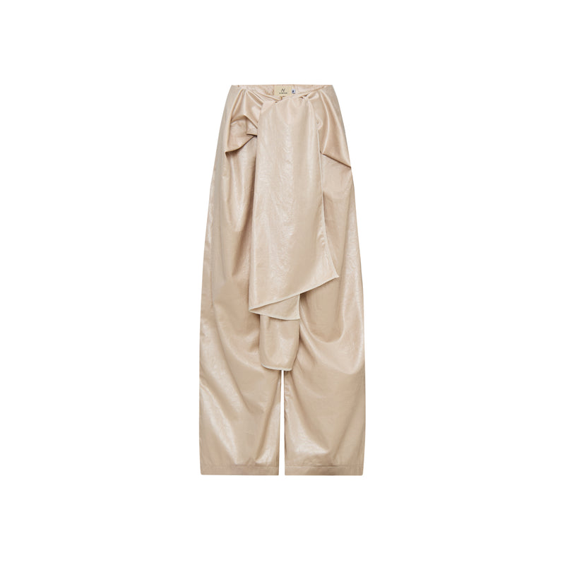 - The farmer’s essence is reflected in the front tie detail of the trousers crafted in modern leather, creating a dialogue between tradition and modernity.